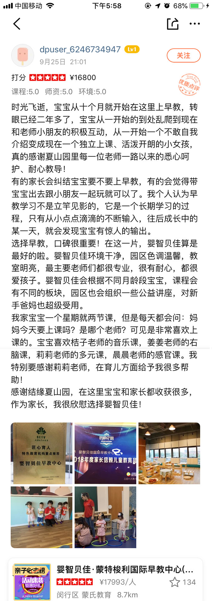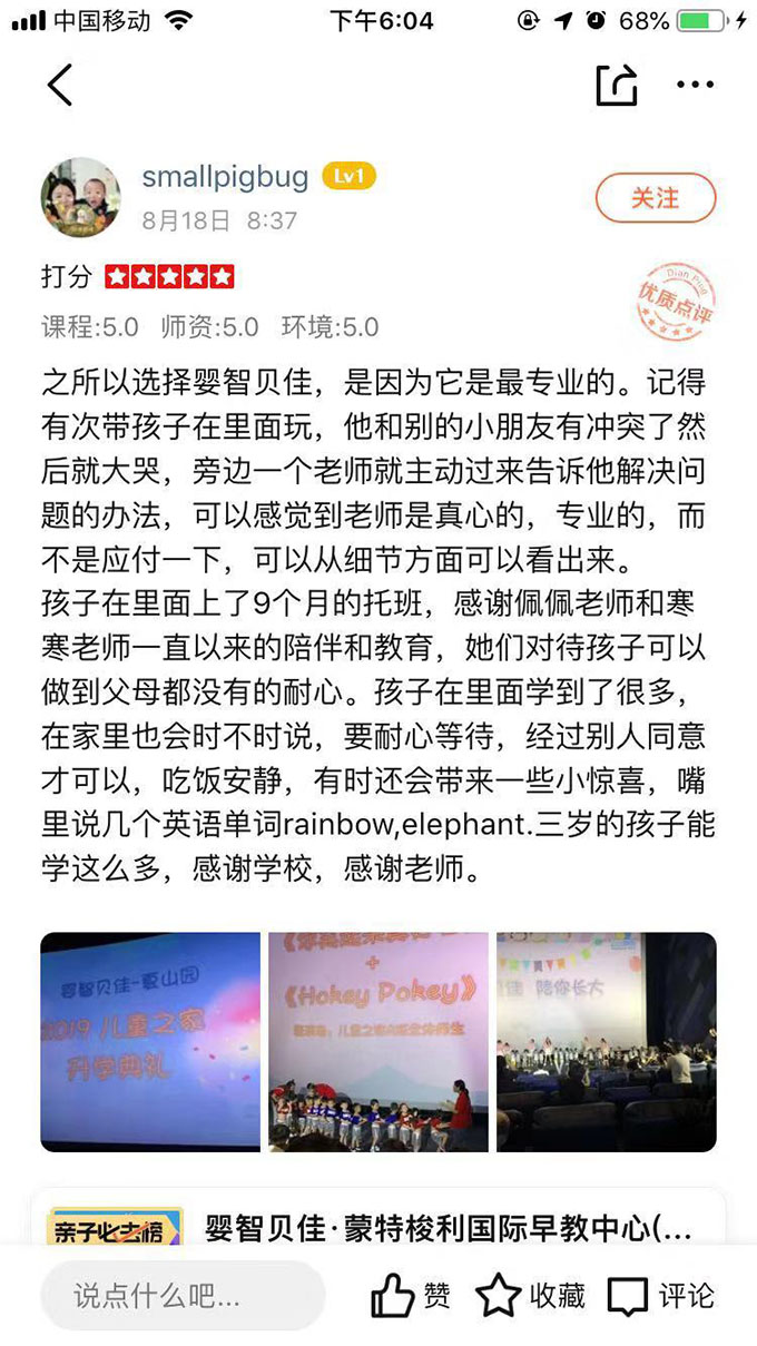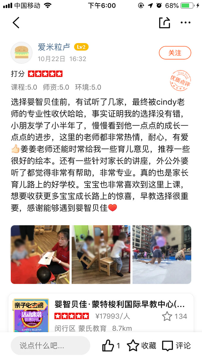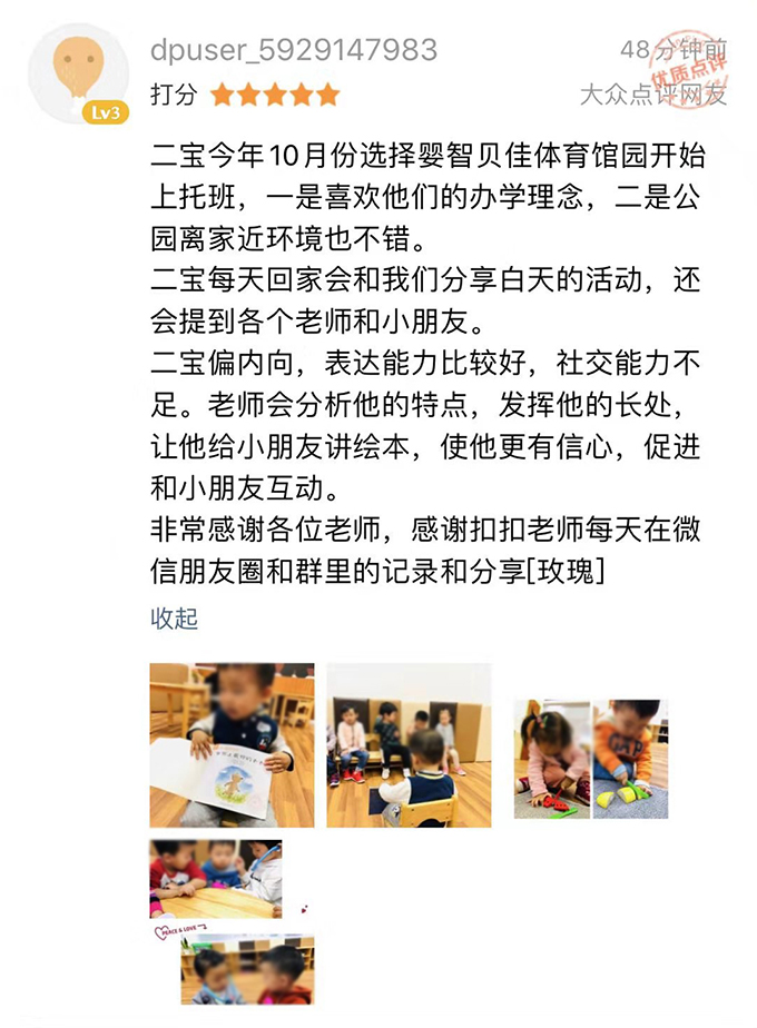 嬰智貝佳自創(chuàng)立以來(lái),因快樂(lè)高質(zhì)量的課程服務(wù)和良好的師資培養(yǎng)機(jī)制,得到眾多寶寶家長(zhǎng)的認(rèn)可,享有良好的社會(huì)口碑,這次能夠榮登大眾點(diǎn)評(píng)網(wǎng)2019親子必去榜,也是實(shí)至名歸。