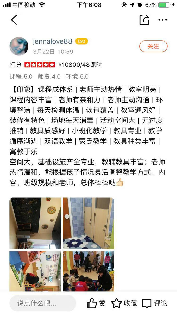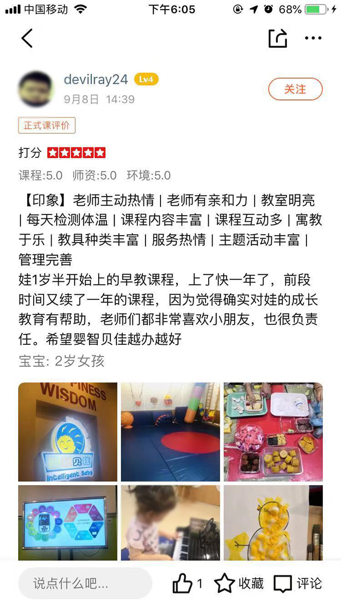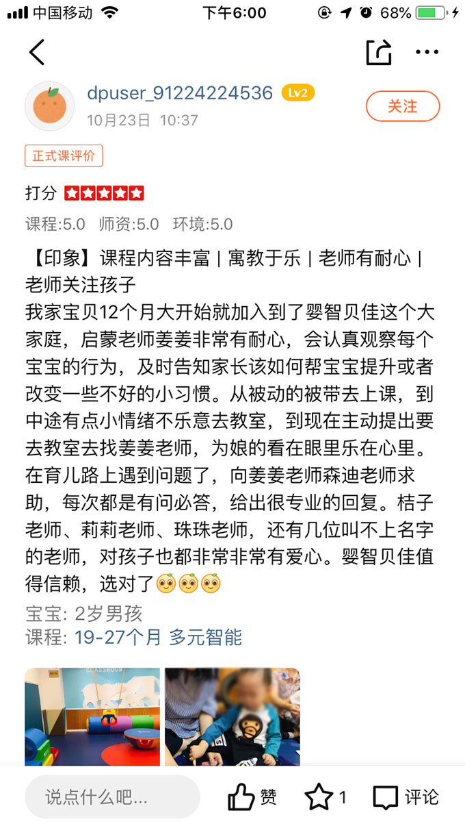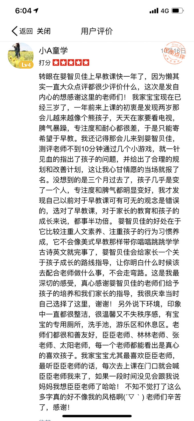 嬰智貝佳自創(chuàng)立以來(lái),因快樂(lè)高質(zhì)量的課程服務(wù)和良好的師資培養(yǎng)機(jī)制,得到眾多寶寶家長(zhǎng)的認(rèn)可,享有良好的社會(huì)口碑,這次能夠榮登大眾點(diǎn)評(píng)網(wǎng)2019親子必去榜,也是實(shí)至名歸。