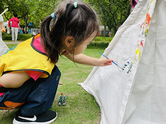 本次的壓軸大戲:DIY的小帳篷 搭好了,就等寶貝們開展想象力動手了。